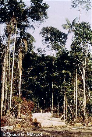 Explanation: This is a rodeo ... no, not a rodeo with calf-roping and barrel racing ... but the Spanish rodeo meaning a log-landing site in a tropical forestry operation, in the upper Amazon Basin of northeastern Bolivia. Seasonally wet tropical forests of the upper Amazon Basin are often harvested for lumber and a variety of forest products. This forest concession has been selectively cut for large old trees and for palmitos. The palms are taken for producing heart-of-palm, which is the sweet inner pith of the growing point of the palm. It
