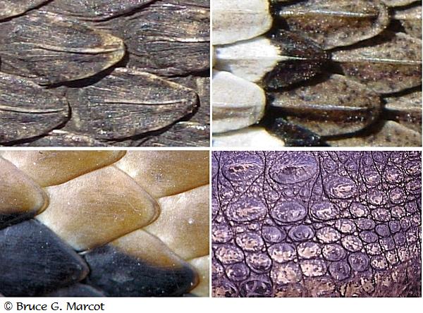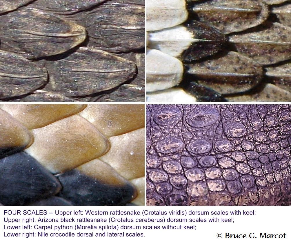 Explanation: This week we are exploring the landscape of scales -- three snakes and one crocodile. The top two photos are of species of rattlesnake found in the U.S. Rattlesnakes belong to the family Viperidae which sport scales having keels or mid-center ridges. What are the ridges used for? In an earlier EPOW we briefly discussed this, and suggested that the keels could provide structural strength. Some have suggested that they might also scatter light and make the body form of these stealthy predators more difficult to detect. Perhaps the keels also make the snake more difficult to eat by other predators. Another use of keeled scales seems to be made by a set of eight Viperid species collectively called saw scaled vipers (Echis spp.) which are found in arid parts of south Asia, the Middle East, and Africa. Saw scaled vipers have a threat display by which they rub sections of their body together to produce a hissing sound. The keels on the scales might contribute to the production of this sound. (Interestingly, too, some other snakes such as the common and harmless bullsnake actually do hiss as a warning signal.) Also notice how the Arizona black rattlesnake in the upper left photo has not just a keel on each scale but also a series of ridges. Again, this might serve for structural strength but also -- just speculating here -- might play some kind of role in trapping water, as this species is found in very arid areas of southwest U.S. Whether such secondary uses were the primary advantages that led to selection of such traits is unknown; sometimes an anatomical (or behavioral) feature that has one advantage also has other uses. The photo in the lower left is a carpet python found in Australia, New Guinea, and Indonesia, belonging to the serpent family Pythonidae. These snakes do not have keels on their scales, but instead their scales are quite smooth; compare with the corrugated scales of the Arizona black rattlesnake. Why? It might have to do with pythons' feeding habits; they are constrictors and literally squeeze their prey to death. Having slick scale surfaces might aid being able to more quickly seize and squeeze their prey. And in final comparison is the Nile crocodile in the bottom right photo. Of course, not a serpent but a crocodilian, the Nile crocodile's scales are quite different than those of snakes; they don't overlap (forming an imbricate pattern) and vary more considerably in size and shape ... but they probably play some similar roles of protection and reducing body water loss, and perhaps also some degree of waterproofing, as Nile crocodiles are quite aquatic creatures. So there you have it ... superficially similar, the scales of these four species seem uniquely attuned to each species' habitats and life habits. A tale of four scales.