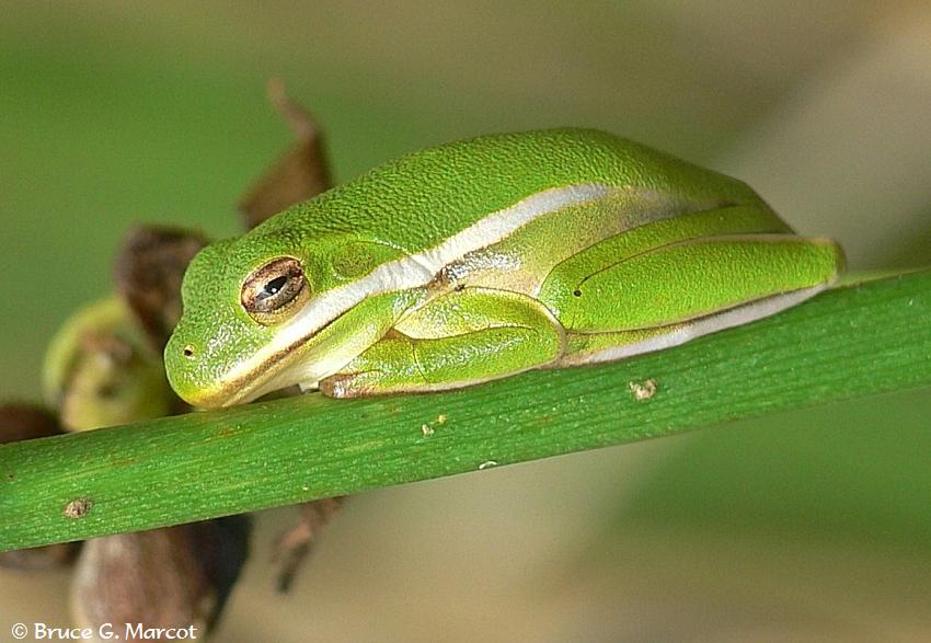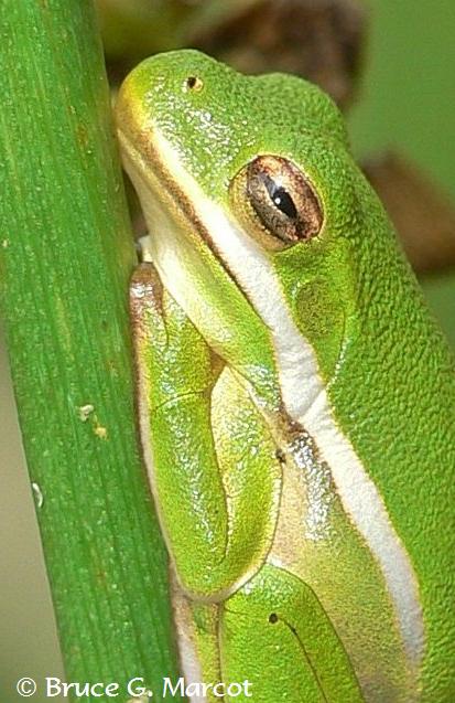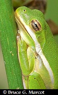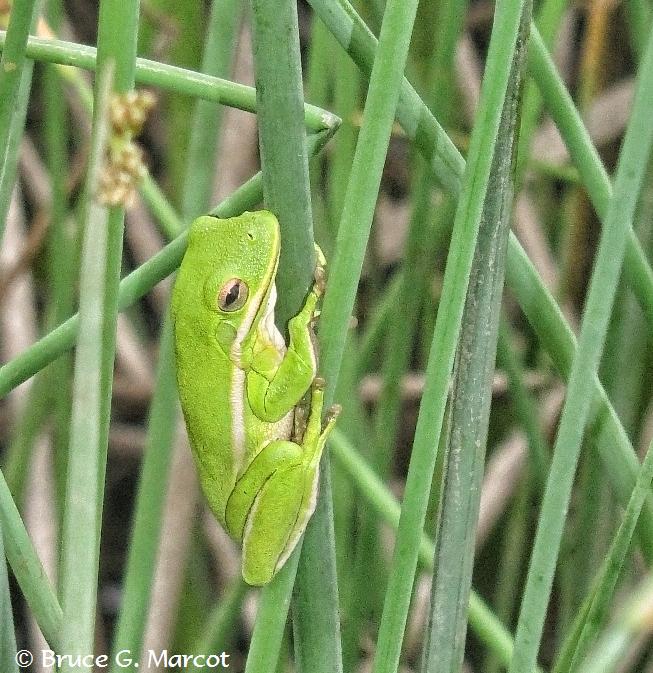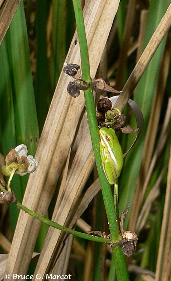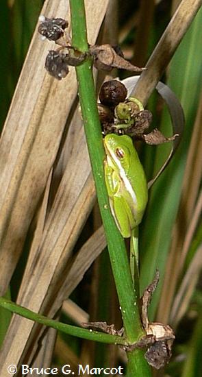 Explanation: In closeup, this diminutive American tree frog looks obvious, perched on a bulrush stem (note: the above main photo was turned sideways). But start to back off, and the reason for its coloration and patterning becomes more obvious: