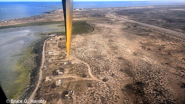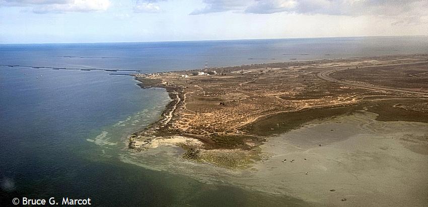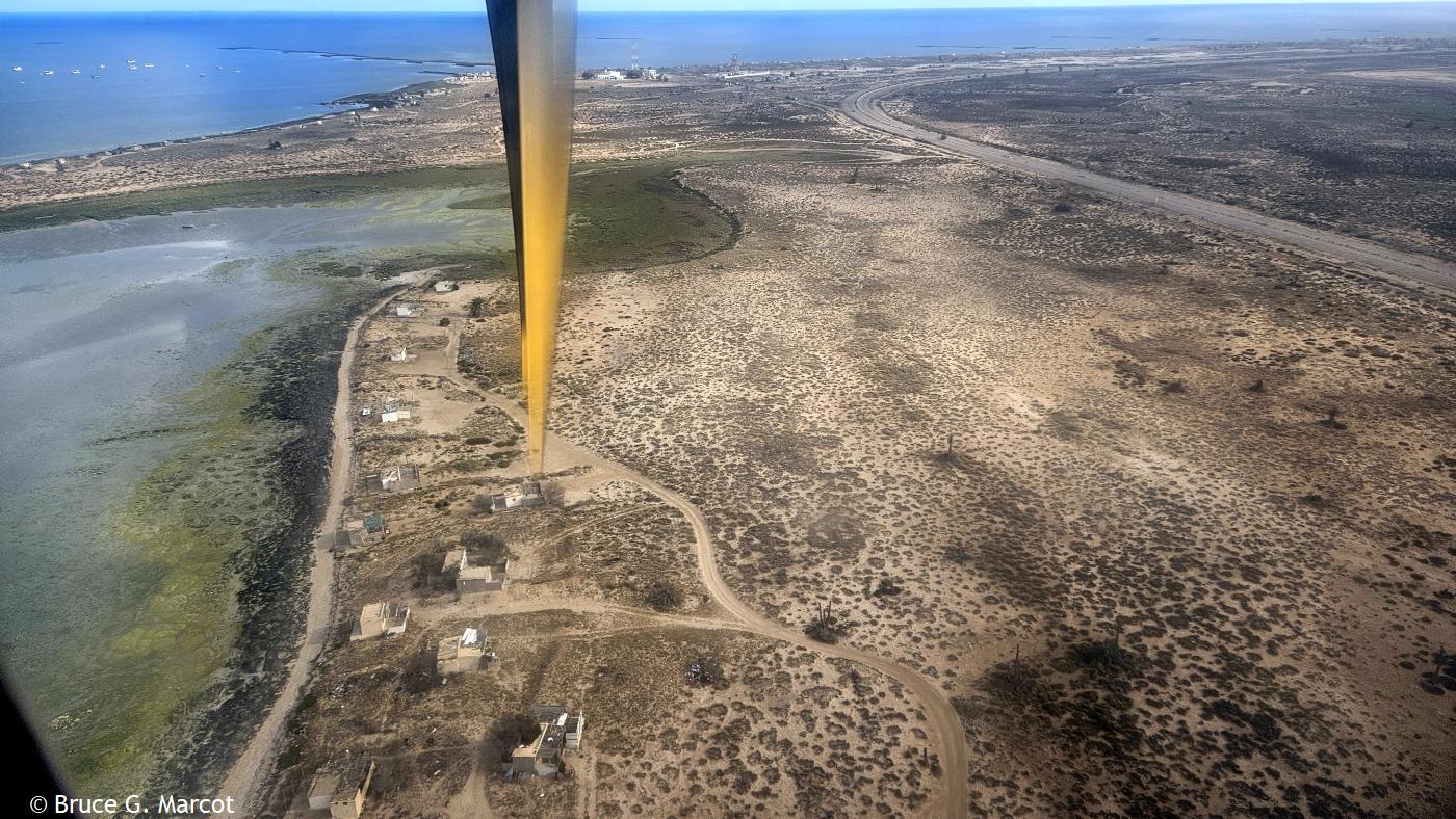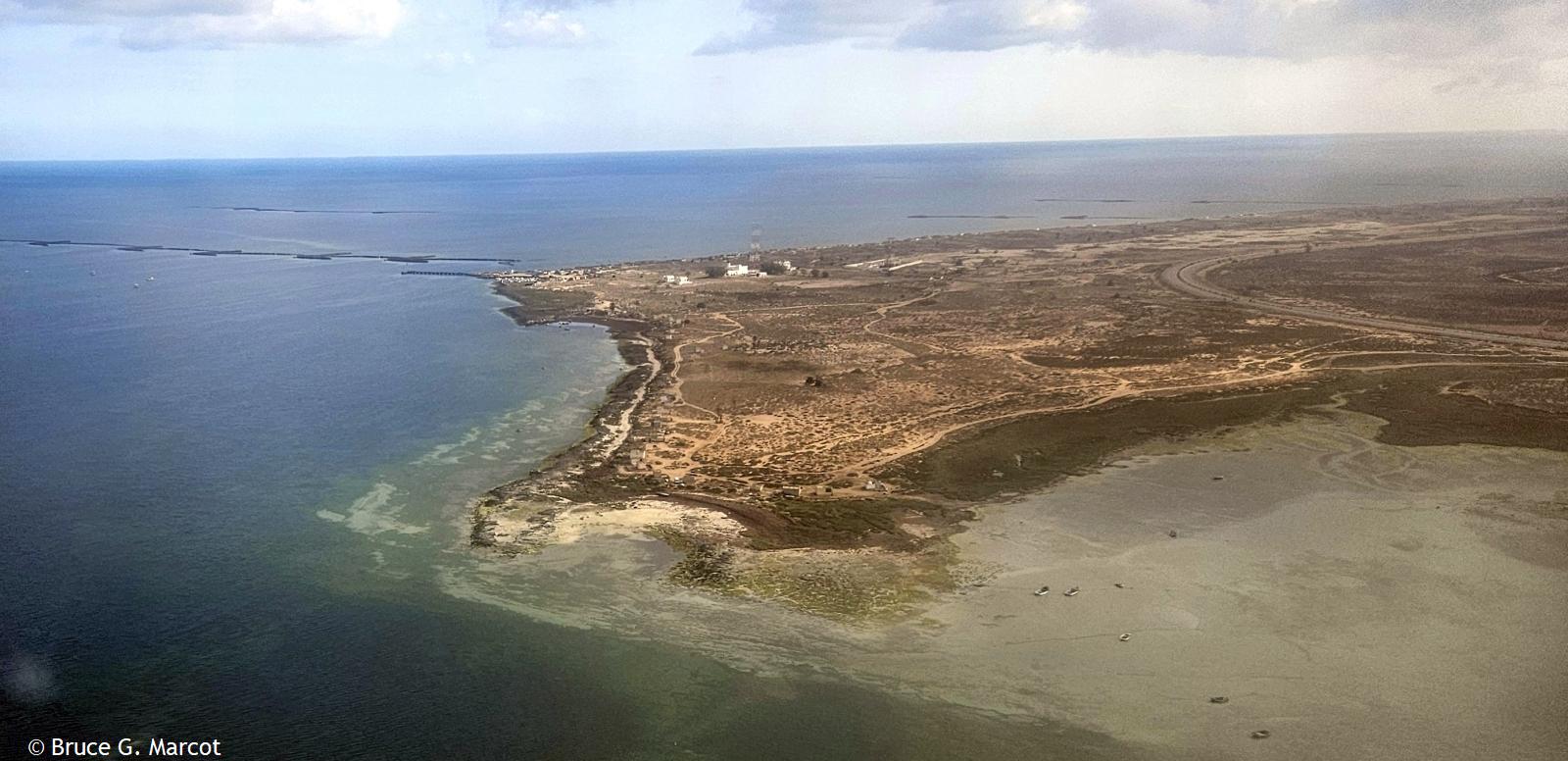 Explanation: Ah, our flight down the coast from Tunis, the capital city of Tunisia in north Africa, is angling over a final approach. Here is the edge of Djerba Island (sometimes spelled Jerba), also part of Tunisia, that straddles the Gulf of Gabes on the side of the Mediterranean Sea, and the Boughrara Gulf on the more sheltered side of mainland Tunisia. Djerba island is remarkably flat, with an average elevation of only 23 ft (7 m) and the highest point only 157 ft (48 m) above sea level. But much has been learned, and can be learned, from this remote site. Djerba Island has been used for years as a key site for monitoring the impacts of environmental degradation such as from increased urbanization, the spread of palm, olive, and tree plantations, and land use changes, and climate change, and the impacts of all this, and more, on coastal erosion and flooding (Bijay et al. 2024). Other studies have tracked how the tourism boom on the island over the last 60 years has led to real and potential disappearances of some of the beaches. Results suggest that 63% of the northeast coastline has a high to very high vulnerability, whereas 37% of the southeast coastline has low to moderate vulnerability (Boussetta et al. 2023). Such studies can help guide planning and management of coastal environments to help thwart impacts of sea-level rise. Further work sampling microplastics on eight Djerba Island beaches found that they varied in type and density among the beaches, resulting from human activities of tourism, fishing, and urban runoff (Guesmi et al. 2025). The results suggest an urgent need for planning and instituting sustainable waste management on the island. And a