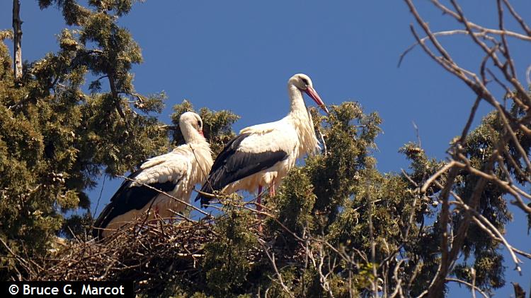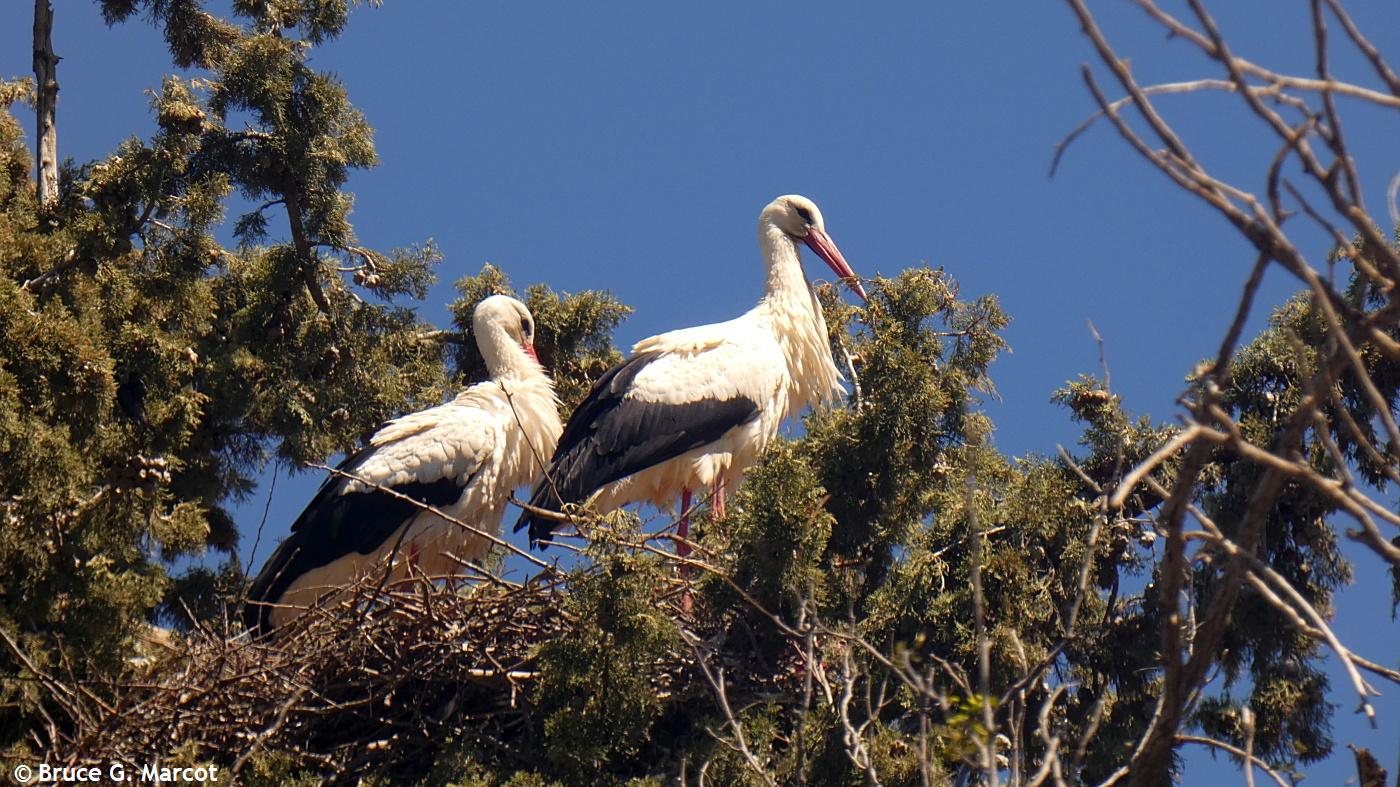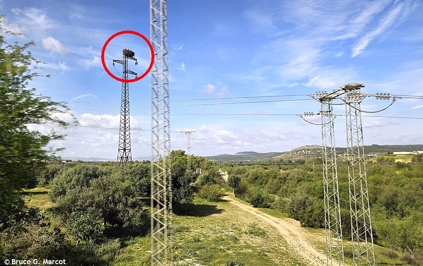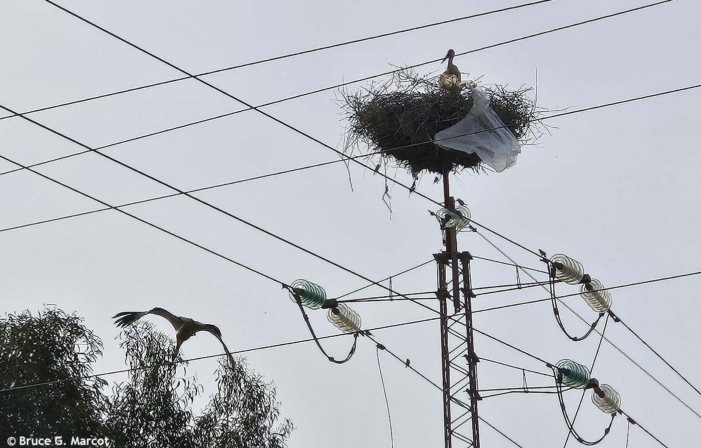 And even isolated nest-site locations may not be free from human intervention. On the northeast coast of Tunisia, in the town of Hammamet, I discovered this White Stork nest in potential double-trouble from the live power lines and from a massive sheet of plastic that had wafted onto the side of its nest: Even in the finest of coastal sea locations, this species has to beware of human interference!