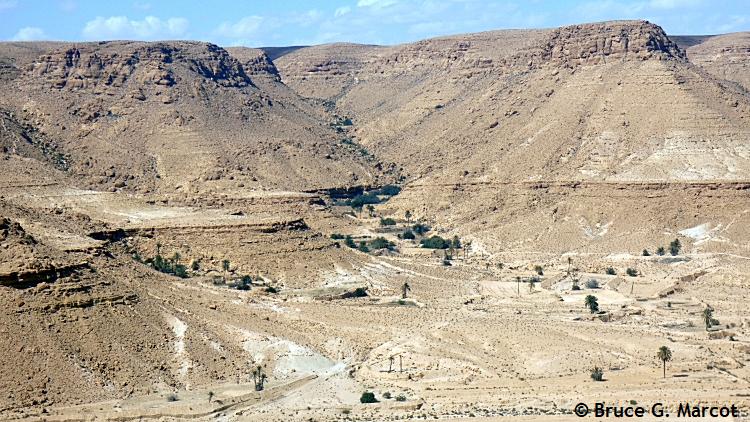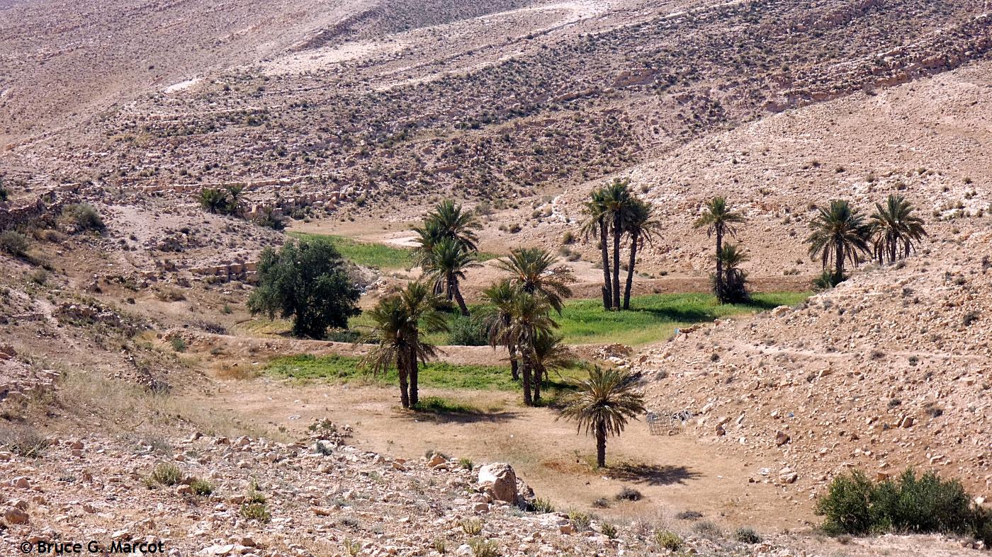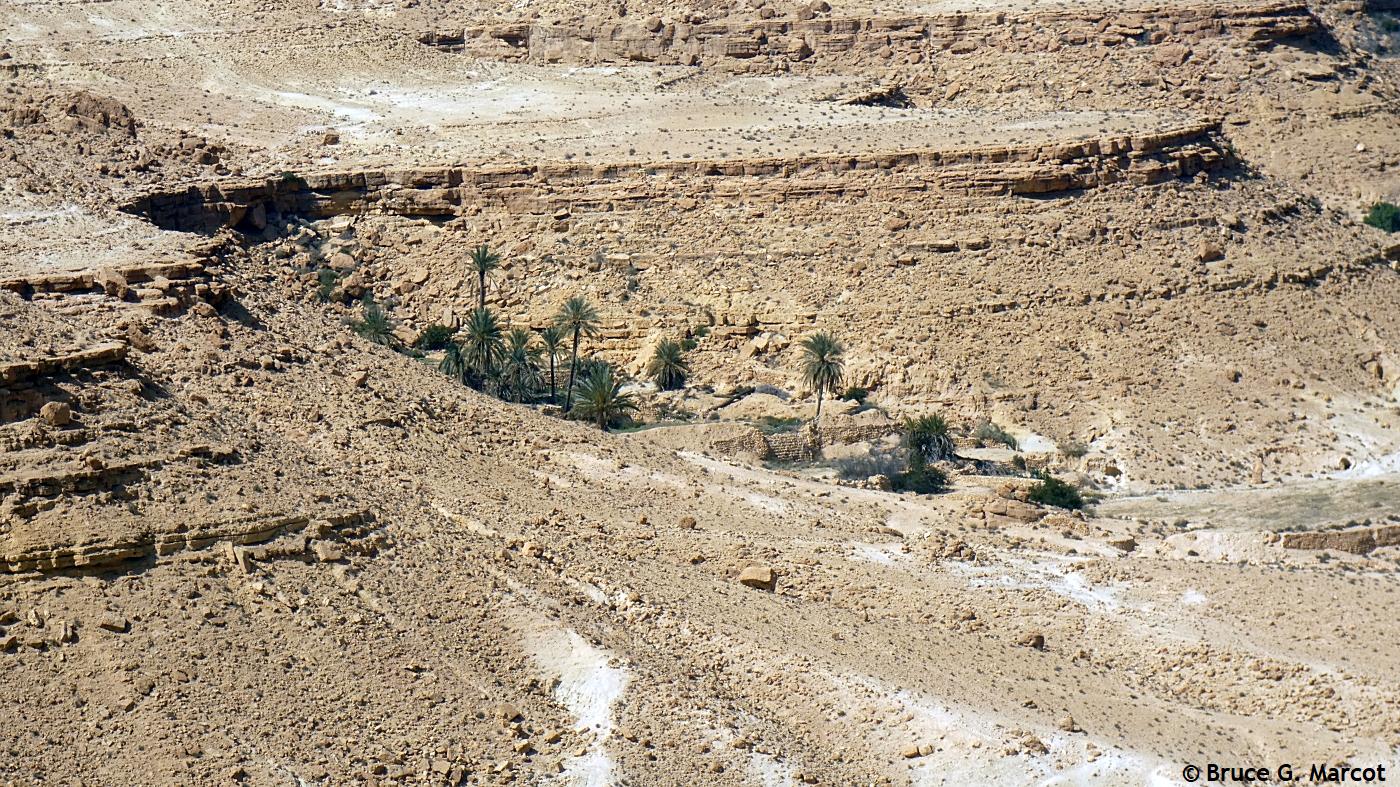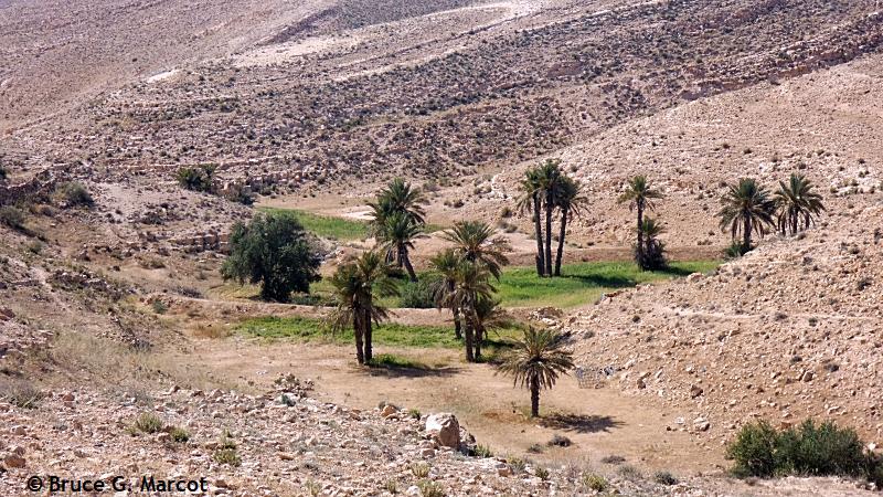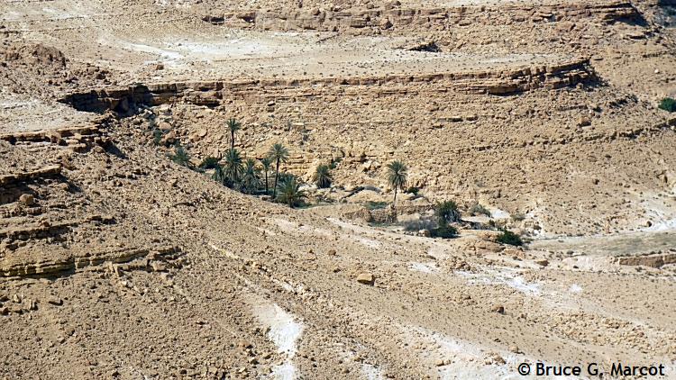 Explanation: How could there be a more classical image of a desert oasis? We are approaching a camp site in the northern Sahara Desert of Tunisia, North Africa. Here, the desert is rocky and immensely dry ... except for the very bottom of occasional ravines where the local water table barely reaches the surface. This is the environment of date palms and associated other plants and wildlife. One study of oasis ecosystems in north Algeria discovered a total of 53 species of birds from 29 families, occupying areas with palms, fruit trees, and cultivated crops. Some 18 of these species are resident breeders, and others occur as seasonal migrants, making the oasis system important habitat for a wide avifauna (see Chiheb et al. 2021). However, oases can