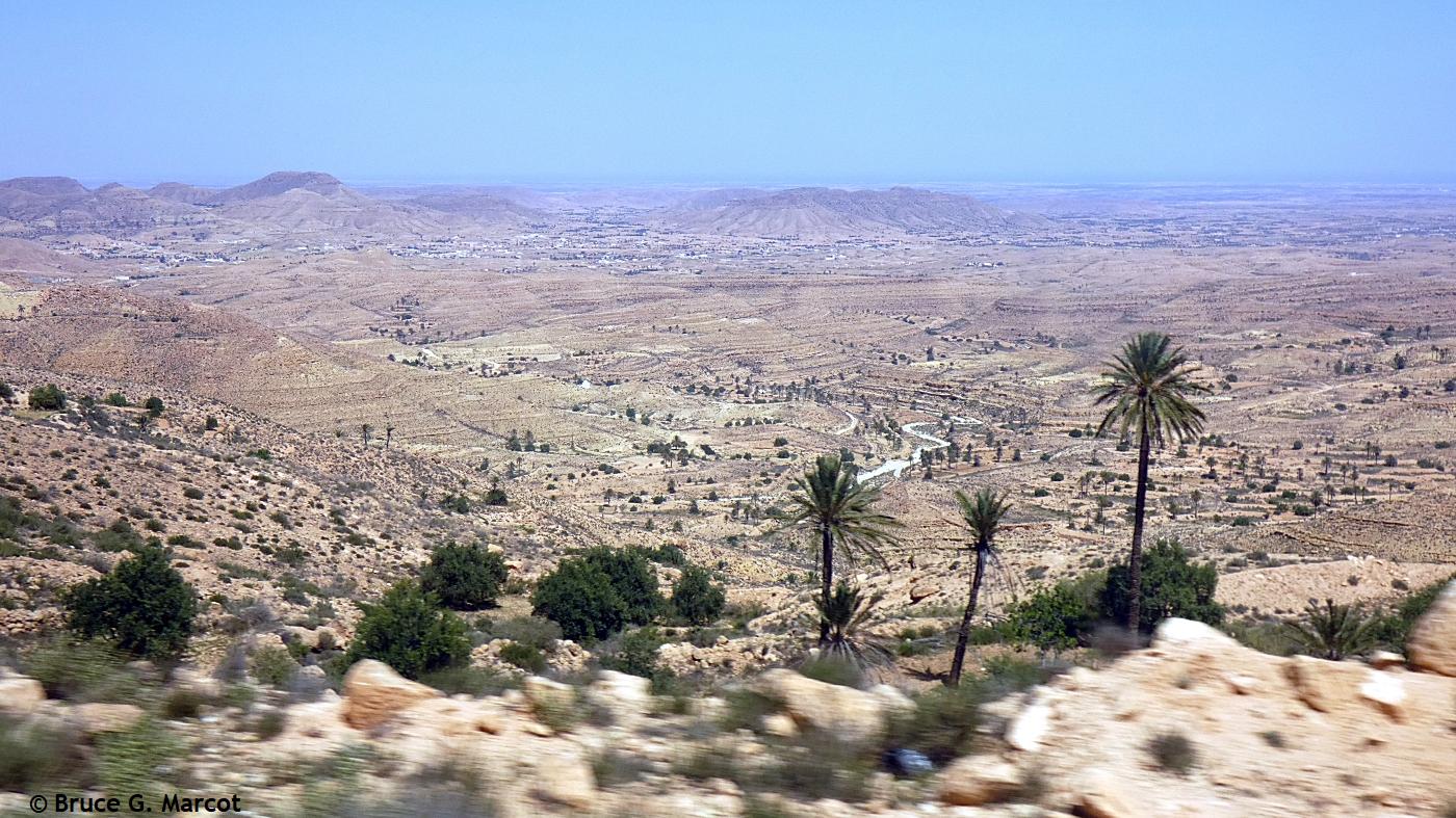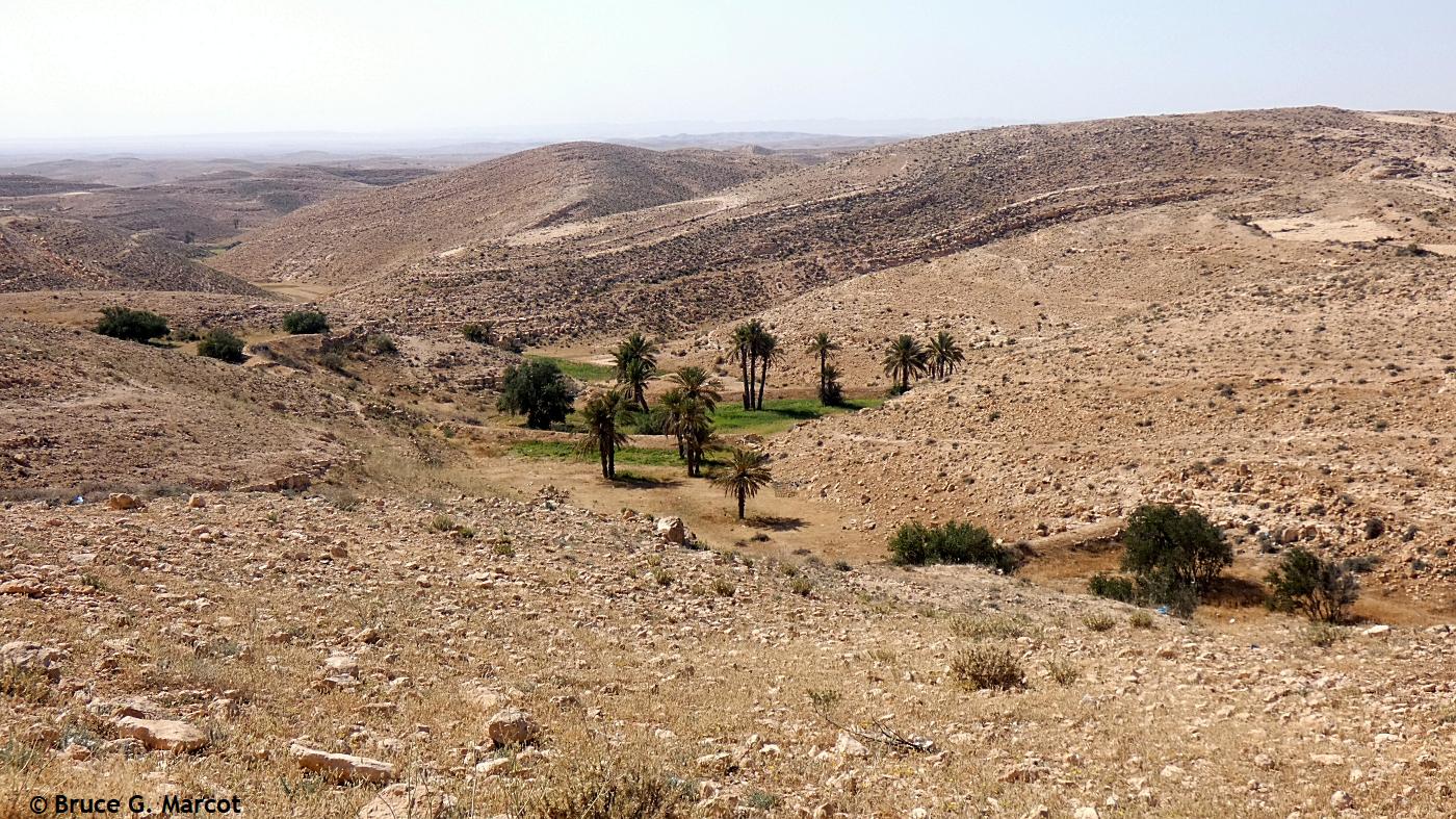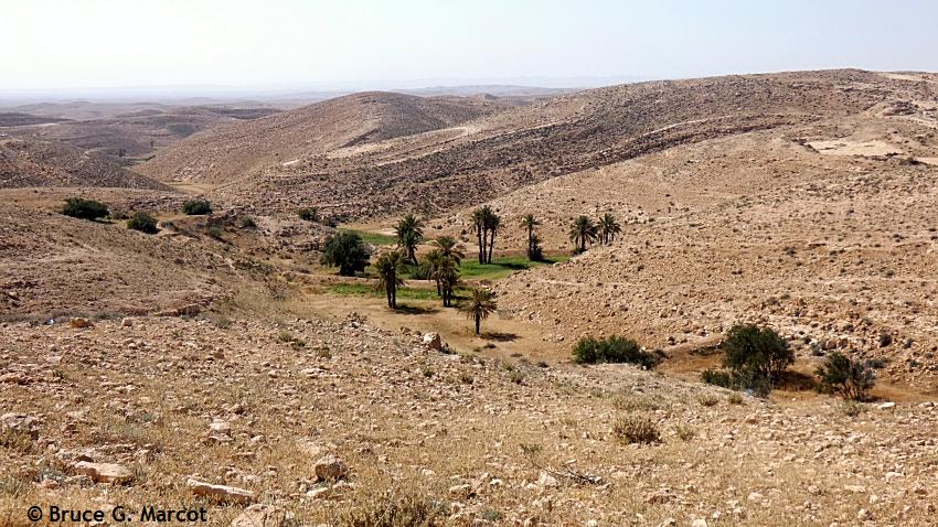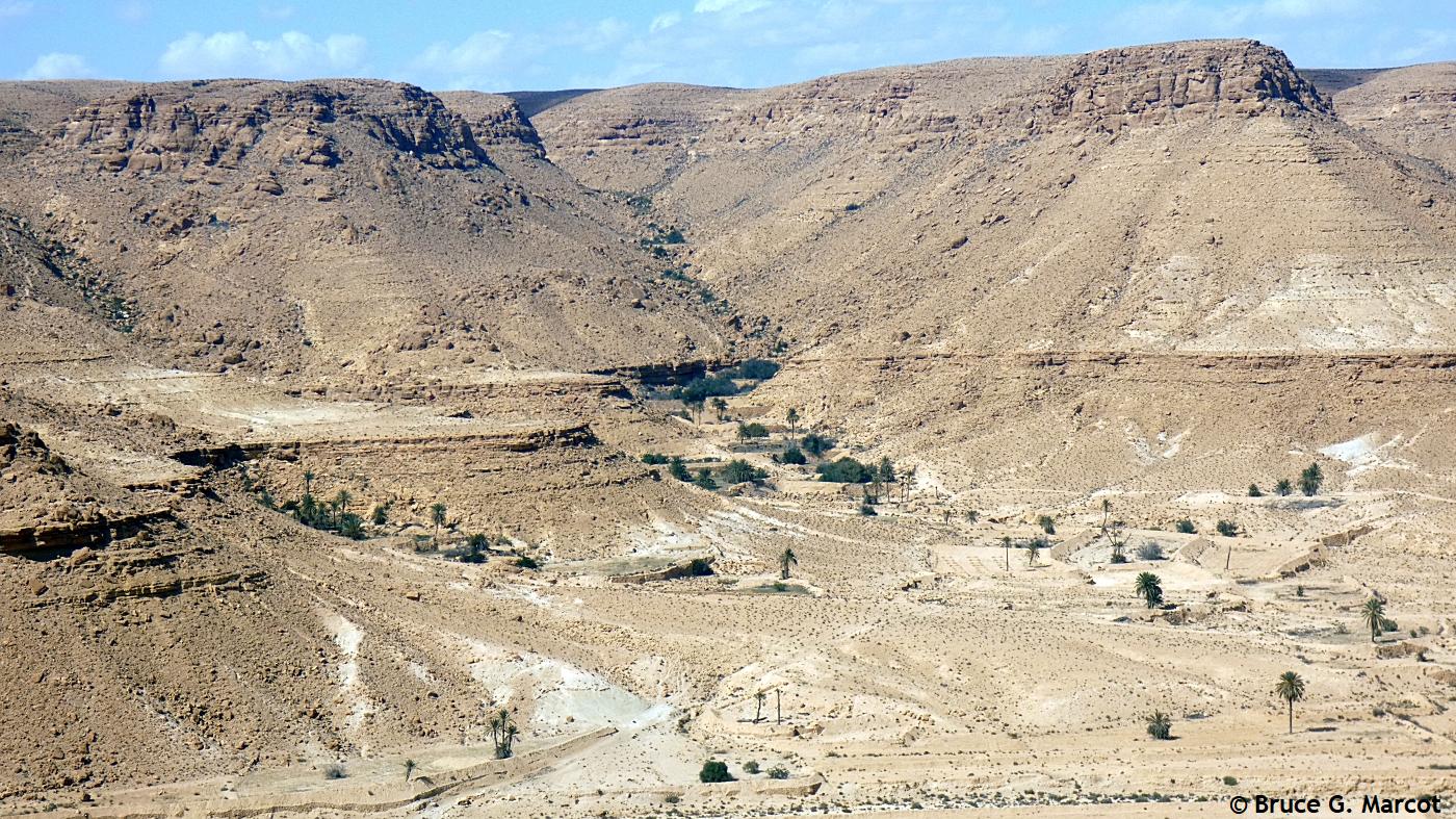 Explanation: How could there be a more classical image of a desert oasis? We are approaching a camp site in the northern Sahara Desert of Tunisia, North Africa. Here, the desert is rocky and immensely dry ... except for the very bottom of occasional ravines where the local water table barely reaches the surface. This is the environment of date palms and associated other plants and wildlife. One study of oasis ecosystems in north Algeria discovered a total of 53 species of birds from 29 families, occupying areas with palms, fruit trees, and cultivated crops. Some 18 of these species are resident breeders, and others occur as seasonal migrants, making the oasis system important habitat for a wide avifauna (see Chiheb et al. 2021). However, oases can