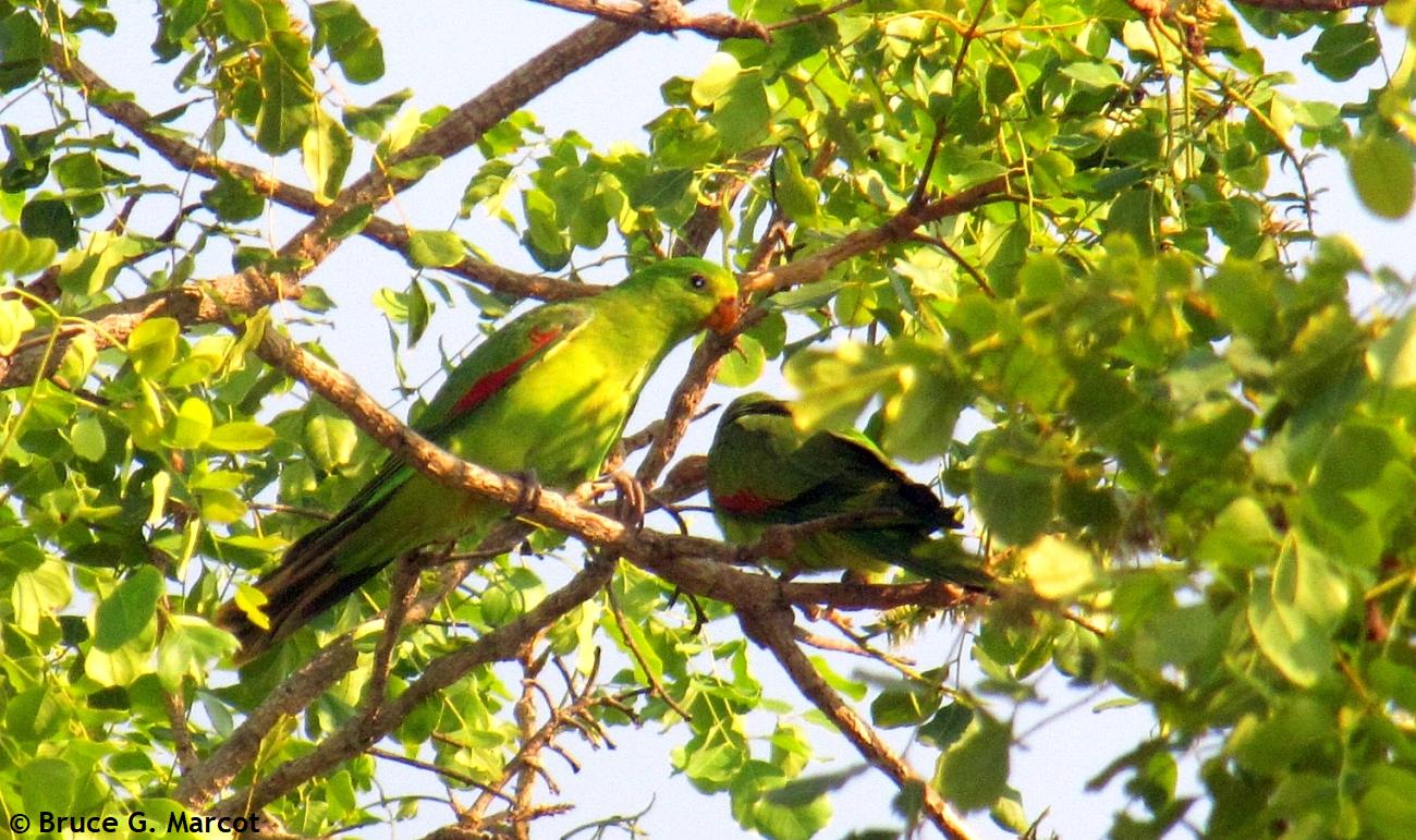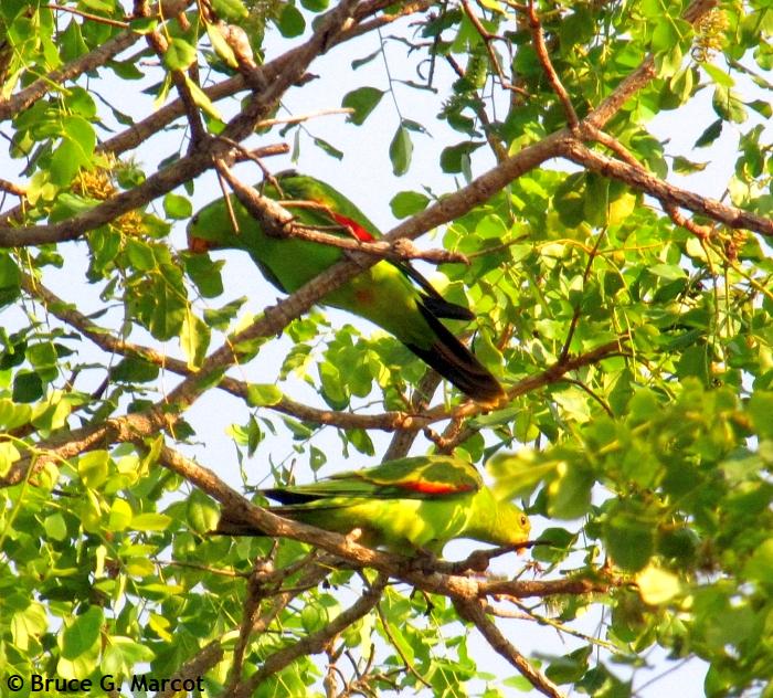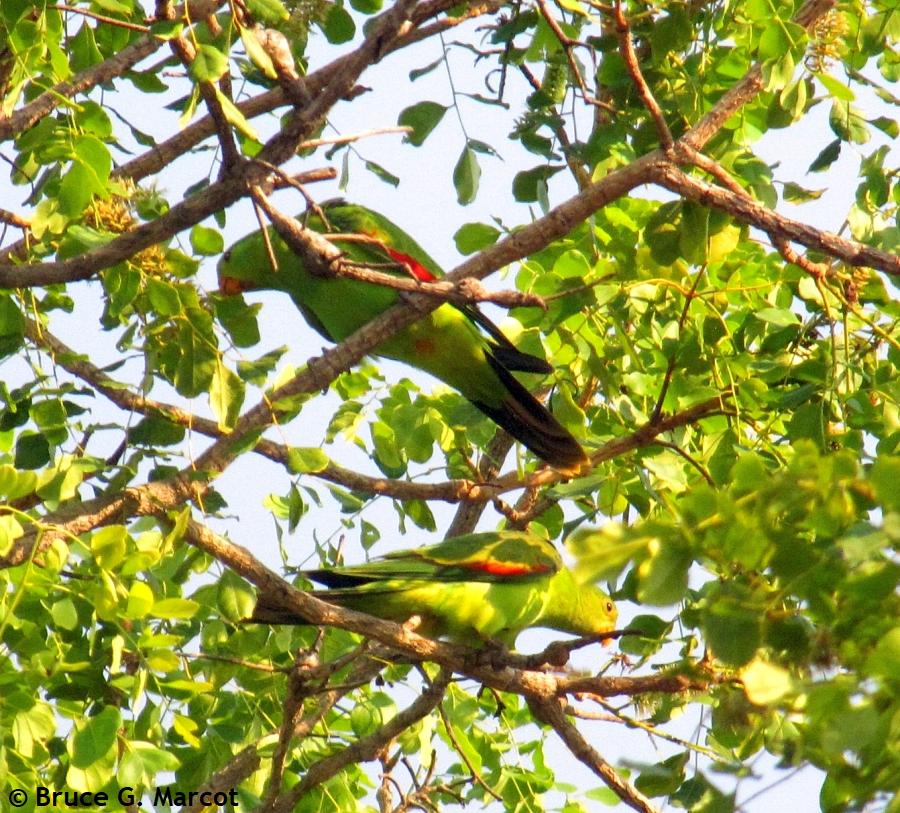 But here, the Red-winged Parrots are green below, so when viewed from below against their tree canopy habitat, they also blend in well. And all this blending is likely local adaptations for predator avoidance. Green on green seems to work well here, for this species, in this environment! |