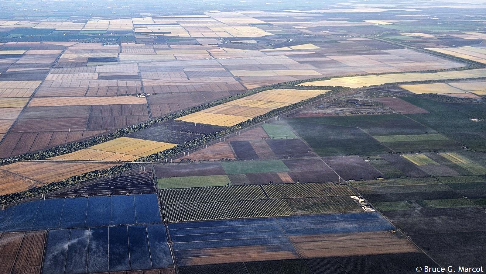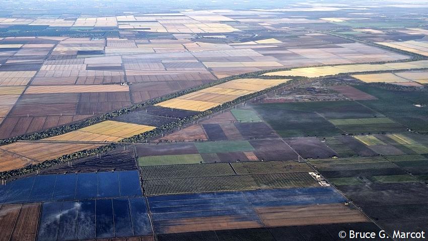 Elsewhere, nearby, are dense croplands and major highways intersecting the levees. This