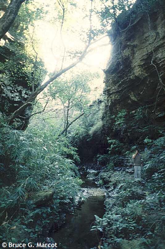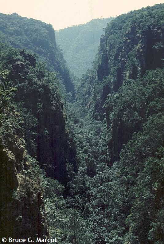 Explanation: Welcome to the mystery gorge of Madhya Pradesh, India! Smack in the center of the country, just south of the town of Pachmarhi, is this steep and deep canyon filled with the most interesting plants and legends. The ravine is some 300 feet (91 m) deep, formed by water erosion. A local story tells that the gorge was once a lake. A demon, taking the form of a giant evil snake, guarded the lake. Eventually, Lord Shiva, the supreme deity of Hinduism, killed the snake, and the force of the battle emptied the lake, leaving the gorge we see today. As the story continues, the shape of the gorge resembles a pot or handi, and khoh translates to cave or canyon. Thus formed Handi Khoh. Large bee hives can be found on the canyon walls, and the site holds habitat for a variety of species including barking deer, Indian flying squirrel, sloth bear, and more. I found that the vegetation was partly dominated by mango (Mangifera indica) and sal (Shorea robusta) trees. The region also provides a wealth of plants of ethno-medicinal value, including a threatened tree fern most important in local folklore medicine.