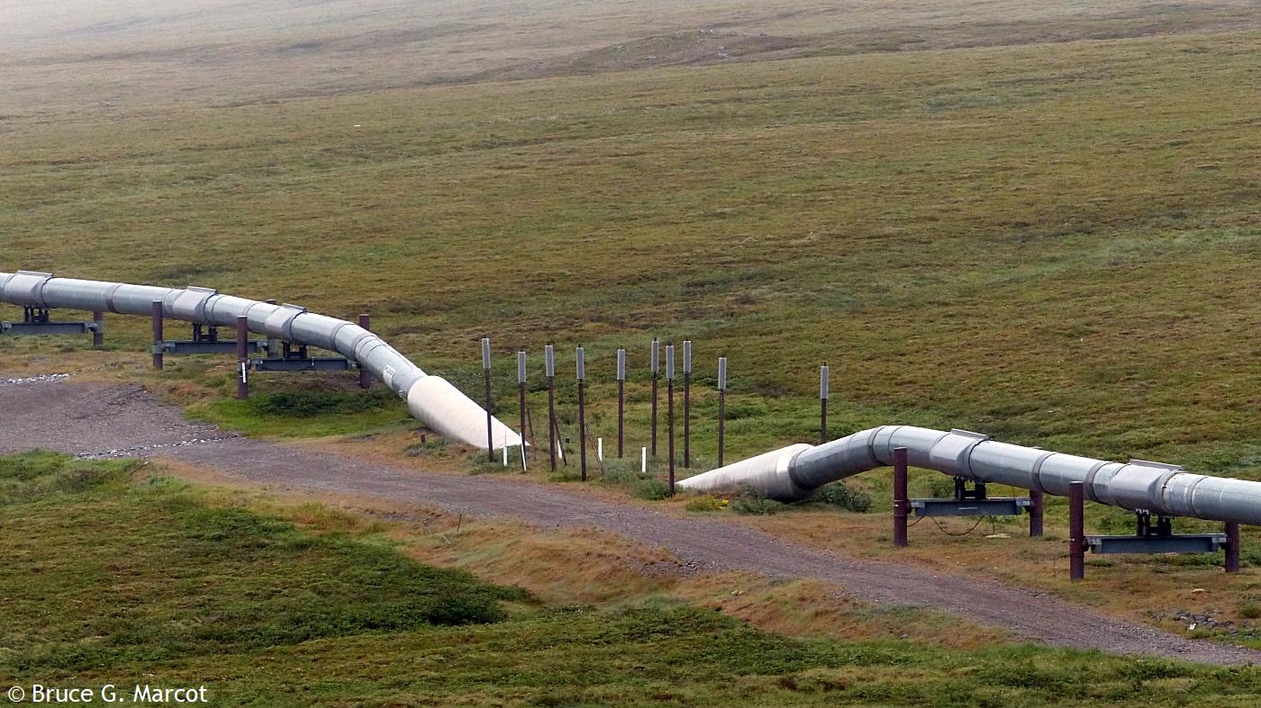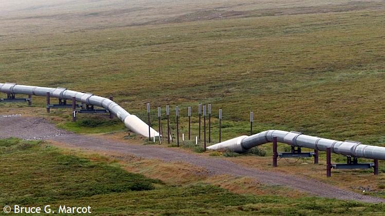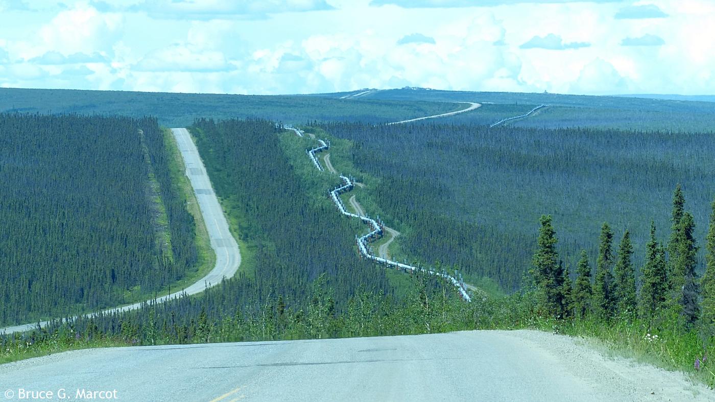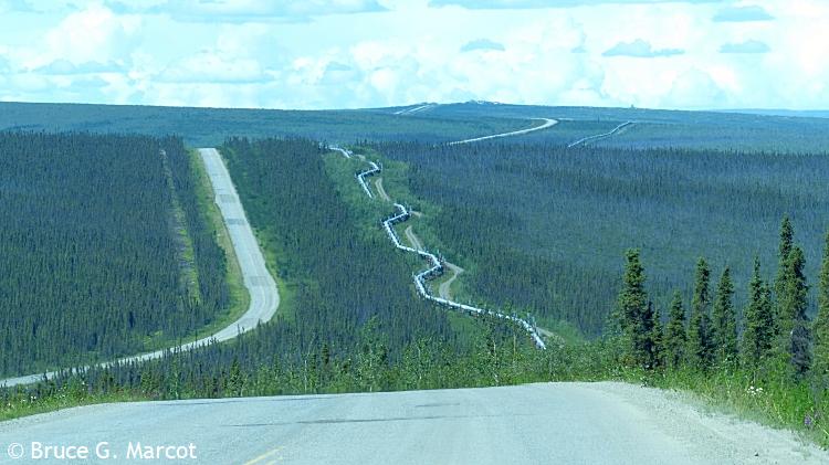 And on it goes, highway racing the pipeline (or vice versa?), across the spruce landscapes and barren tundra, across the mountains, feeding our energy-hungry society with the blood of the Earth. But now, there may be grave threat to the pipeline from regional climate warming and thawing of the permafrost!