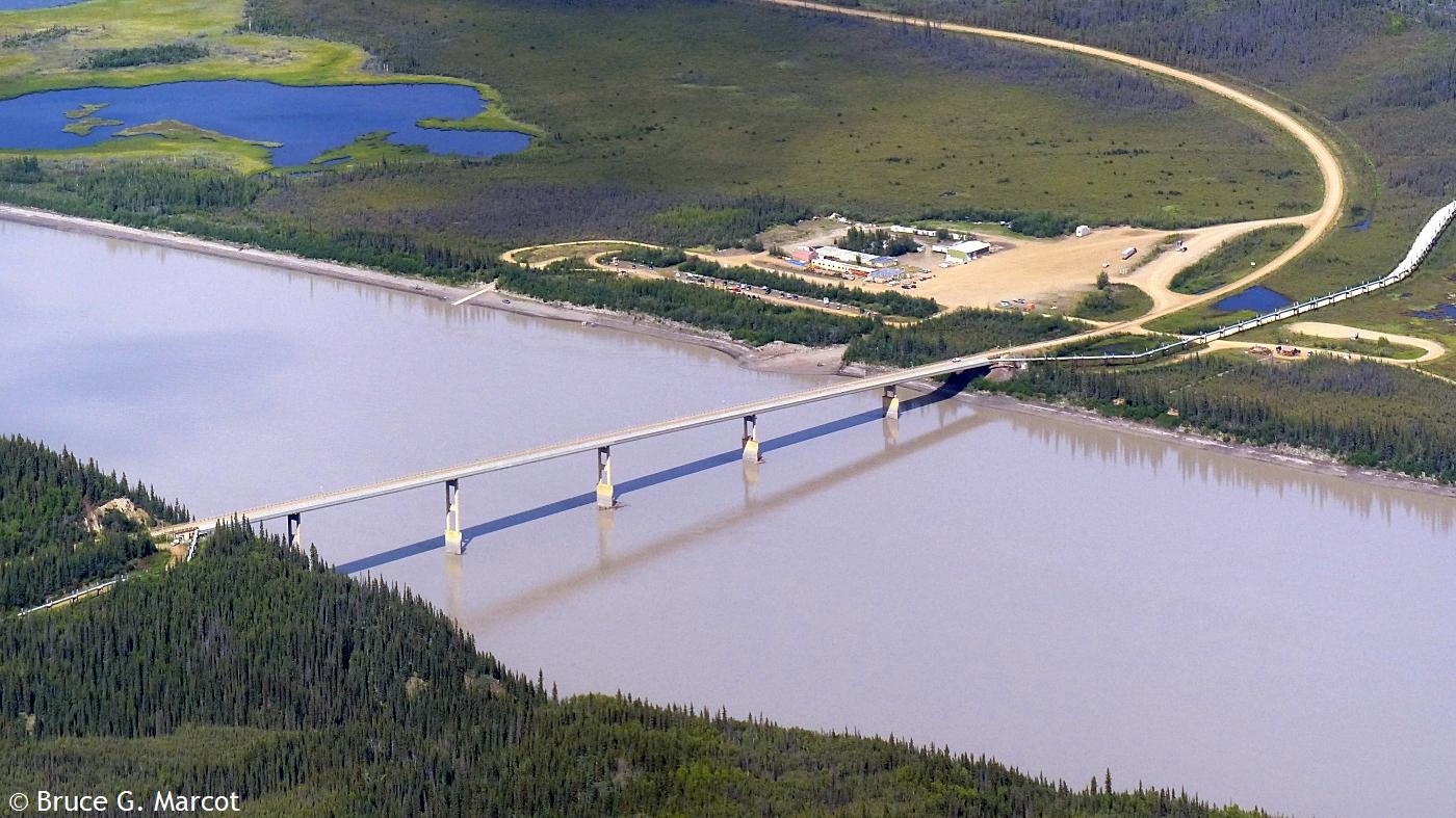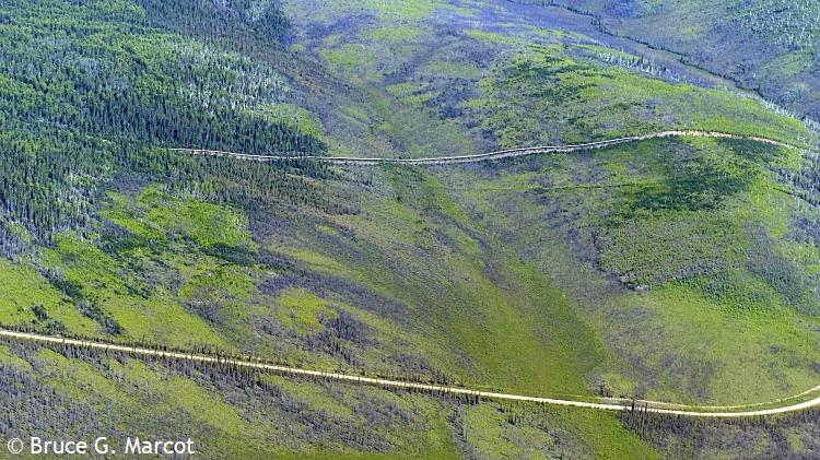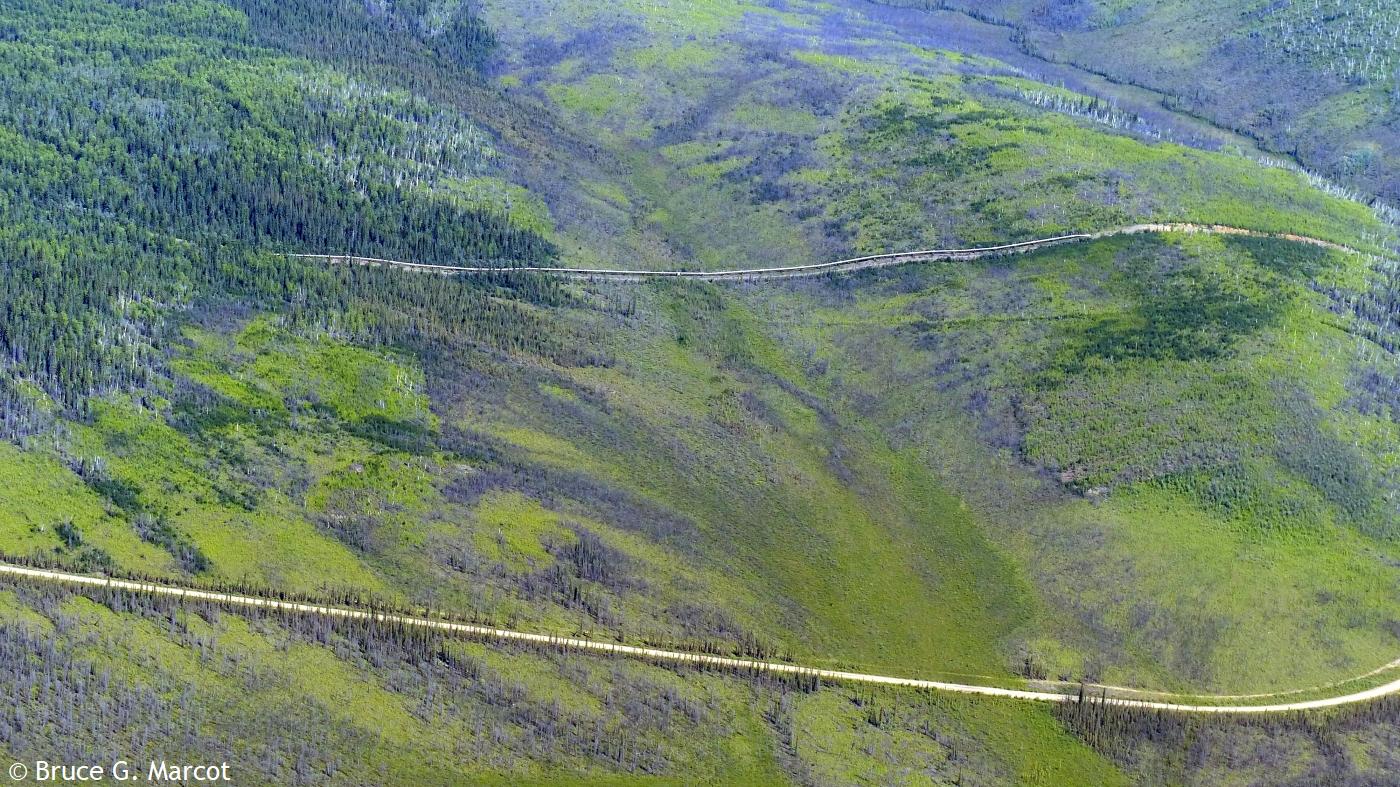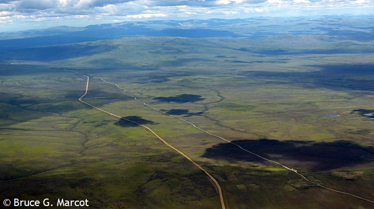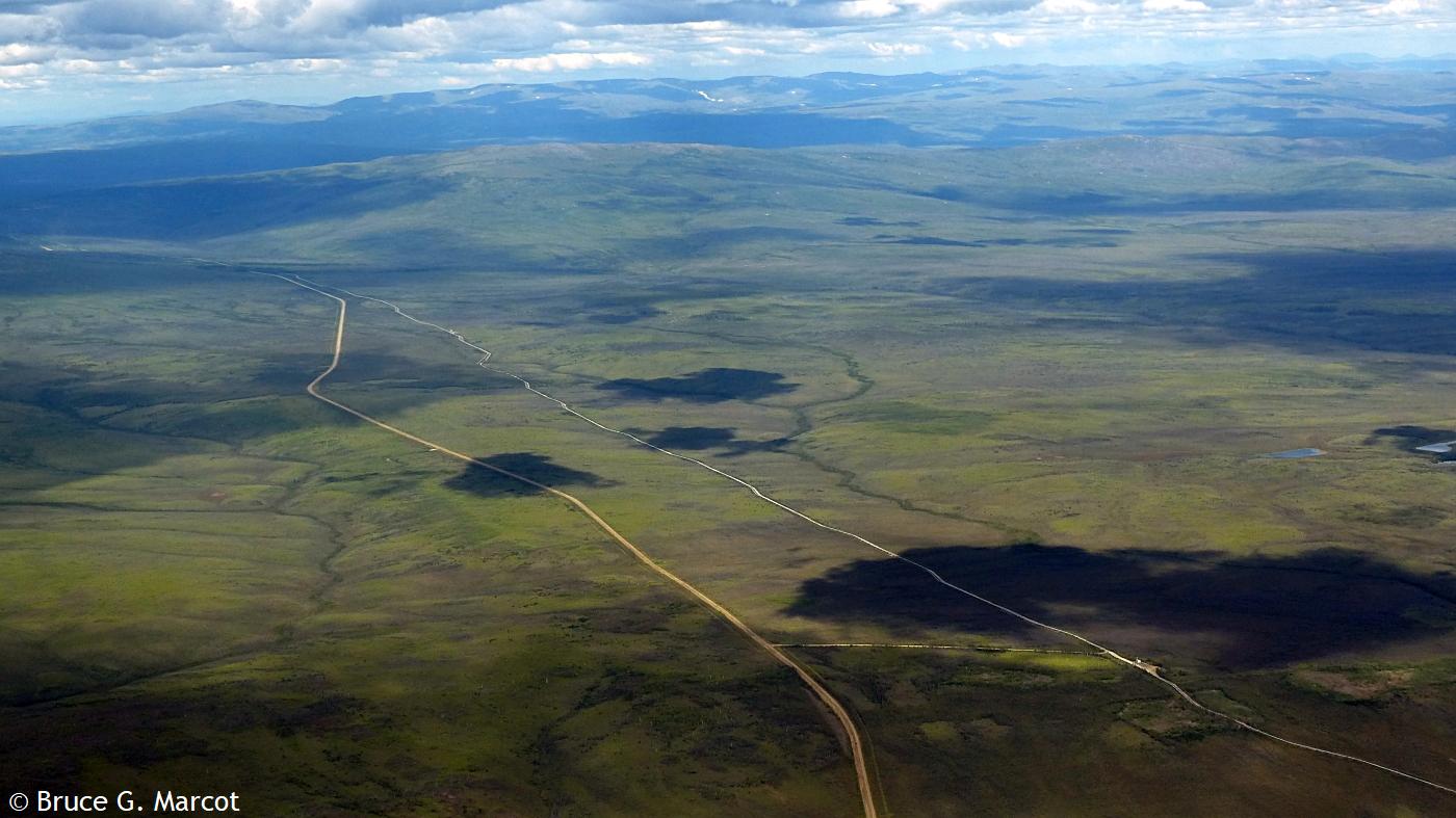 And on it goes, highway racing the pipeline (or vice versa?), across the spruce landscapes and barren tundra, across the mountains, feeding our energy-hungry society with the blood of the Earth. But now, there may be grave threat to the pipeline from regional climate warming and thawing of the permafrost!